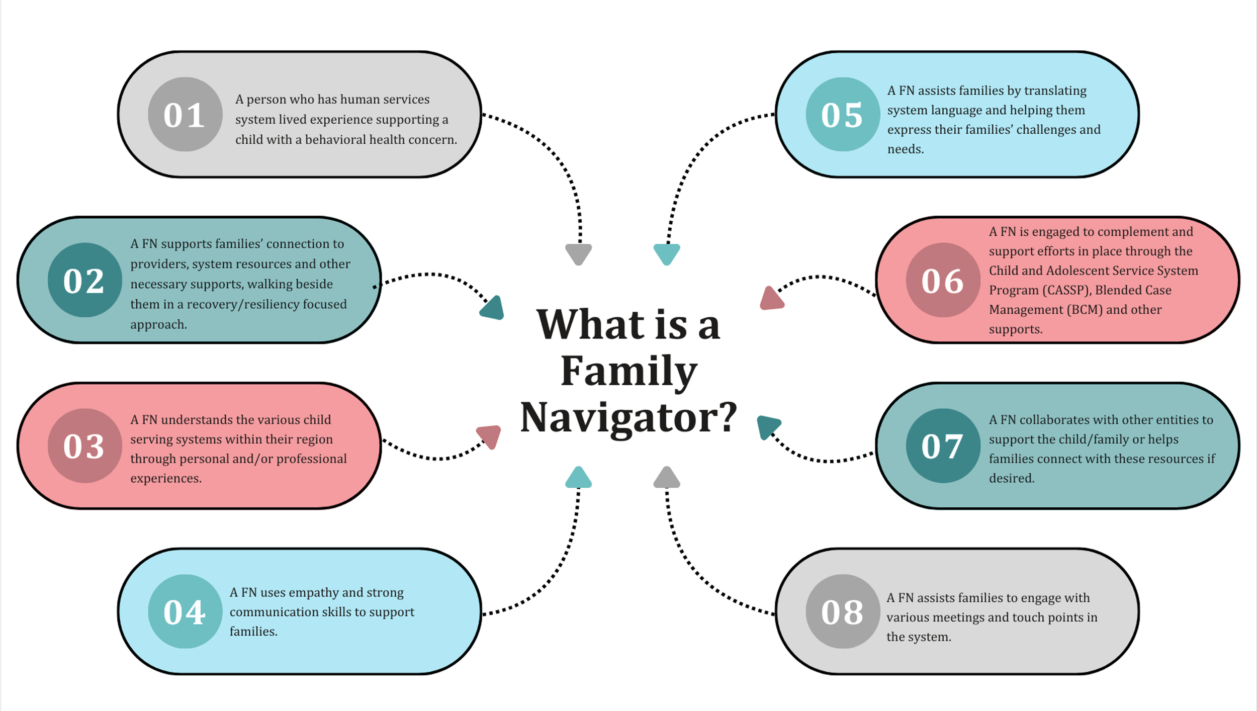 By providing our families with support in the beginning of their journey, they are more likely to be connected to social and clinical supports they need to successfully navigate the behavioral health system.